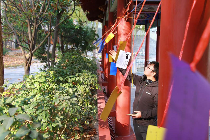 活动第一项为“问天长廊举行典故回忆”,同学们信步走在问天长廊上,查看悬于长廊的纸上的问题,参加有奖竞答。这些纸条上的问题都是有关于一二九运动的内容和一些抗日运动的典型人物,以说出该人物的大致事迹和相关抗日运动内容的形式来提问。只见经过一番思考后,同学们积极回答问题,工作人员根据大家答案的正确与否以及答题的快慢给予了不同的奖励。通过知识竞猜活动,同学们重温“一二九“运动中的历史事迹,充实了思想层面对抗战的正确认识。