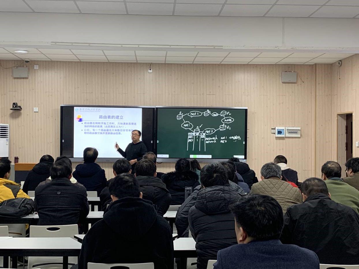 贺杰副教授以《计算机网络原理》课程中的“RIP路由协议”部分为例进行了教学示范,贺教授从如何结合知识点开展课程设计,重难点讲授技巧,应用案例与教学内容相结合等角度分享了教学经验和教学示范。丁克清督导则围绕如何开展一流课程建设,有效提升课堂活力等内容提出了宝贵的意见和建议。