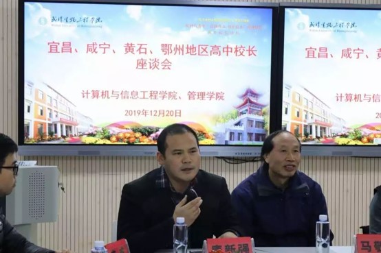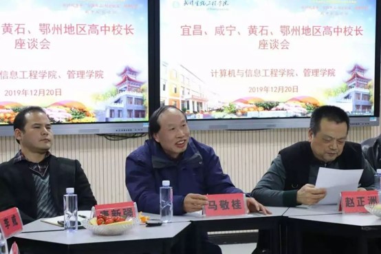 为培育优秀学子,共创佳绩,武汉生物工程学院于12月20日晚在8304举办2019年高中校长论坛交流座谈会。参加座谈会的嘉宾有代校长赵正洲教授,副校长向三久教授,学工处、教务处职能部门领导,计信院、管院党政班子,以及咸宁、黄石、鄂州、宜昌高中校领导及地方招办负责人。本次座谈会由计信院党总支书记唐新强主持。