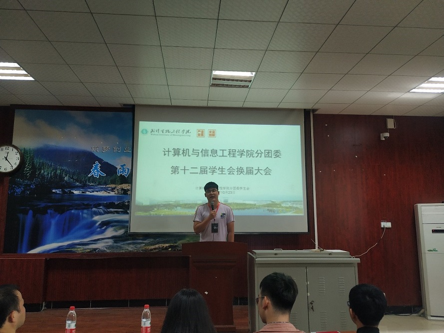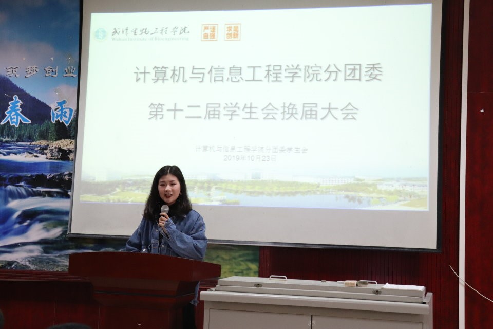 (通讯员:吴优 胡飞扬)金秋十月,武汉生物工程学院计信学院在2019年10月23日12时10分于九阶一教室顺利召开分团委第十二届学生会换届大会。参加本次换届大会的院领导有计信学院党总支书记唐新强,分团委书记黄正华,分团委副书记黄杰、王高勇,第十一届计信学生会主席团及全体部长,各兄弟院系学生会代表、兄弟社团学生代表,以及第十二届计信学生会全体成员,2016级信管专业的胡羽同学主持会议。