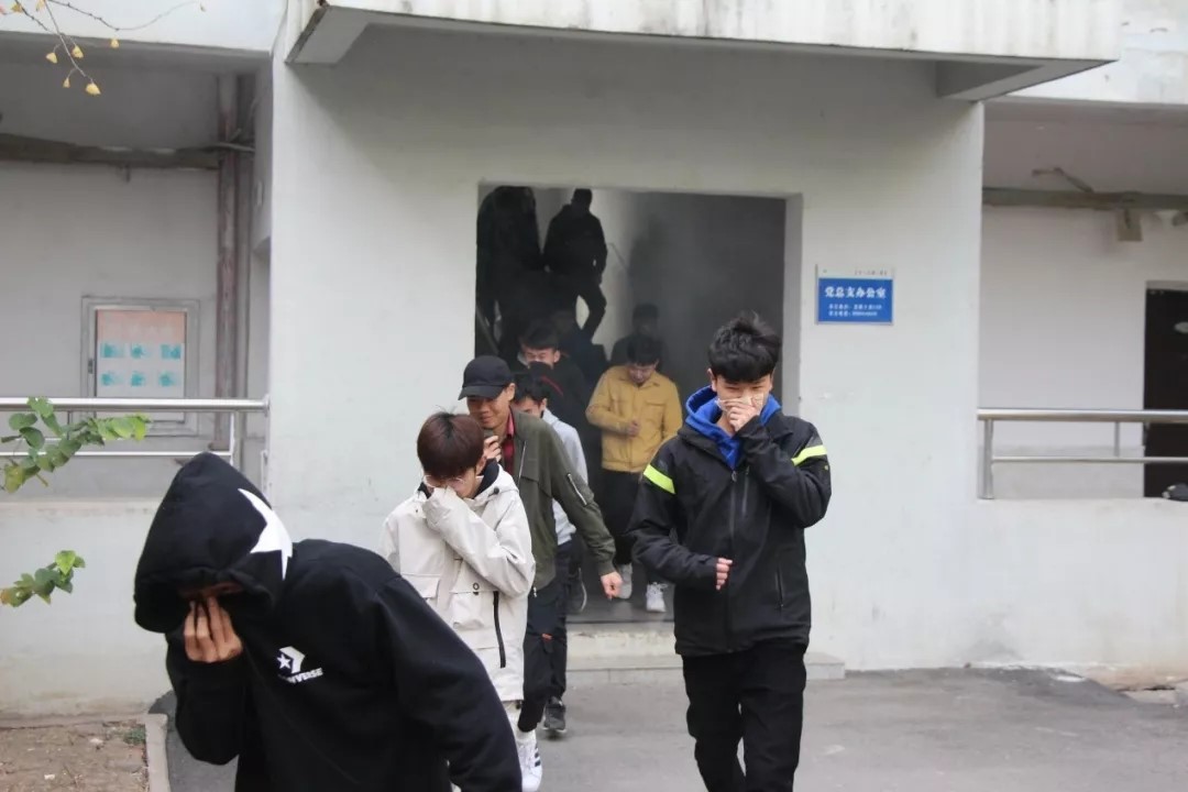 伴随着一阵浓烟袭来,演练在总疏导员“发现火情,请立即撤离”的报警信号中拉开帷幕。在急促的警报和哨声信号下,灭火行动组迅速地展开对险情的勘察并利用现有的消防设施实施抢险救火。在安全疏导员们分别有序的疏散引导下,参加消防演练的师生们弯着腰、用湿毛巾遮住口鼻快速有序的撤离寝室楼,从高到低得有序到达指定位置,完成了演习。