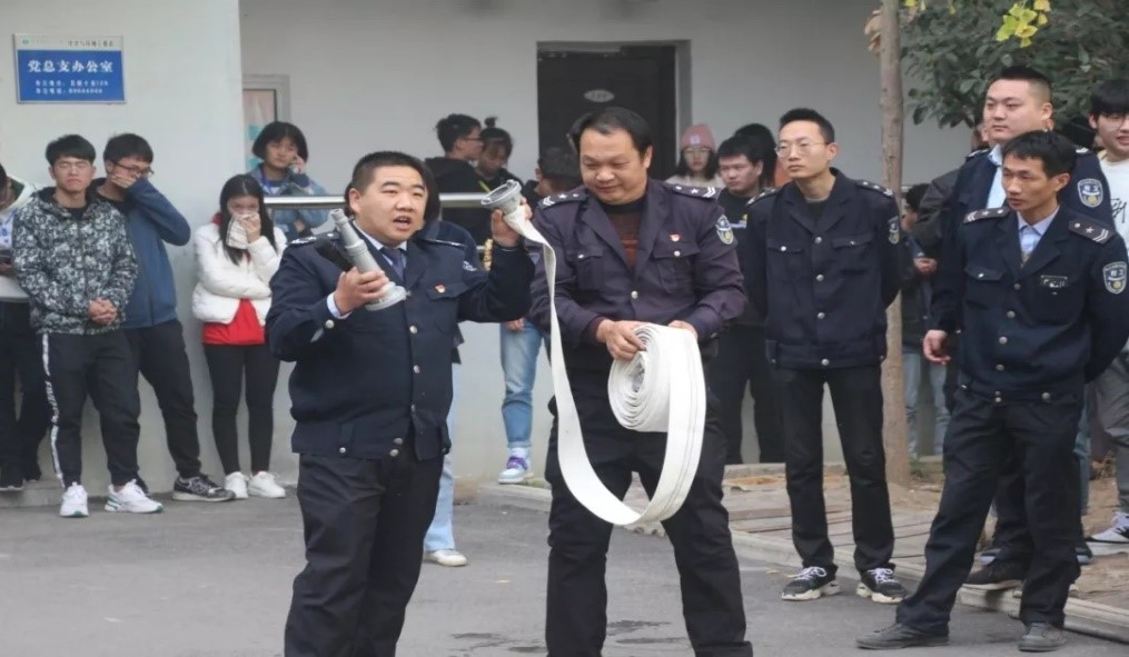 图为保卫处老师向学生示范如何使用灭火器