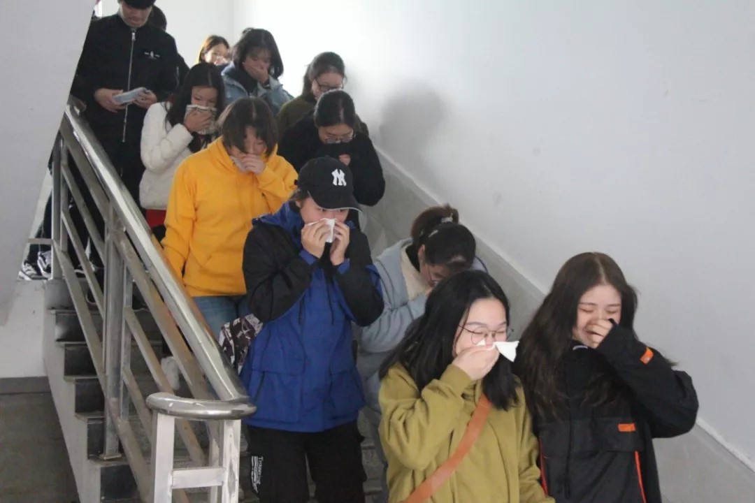 图为演练中逃生中的同学们