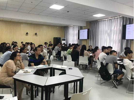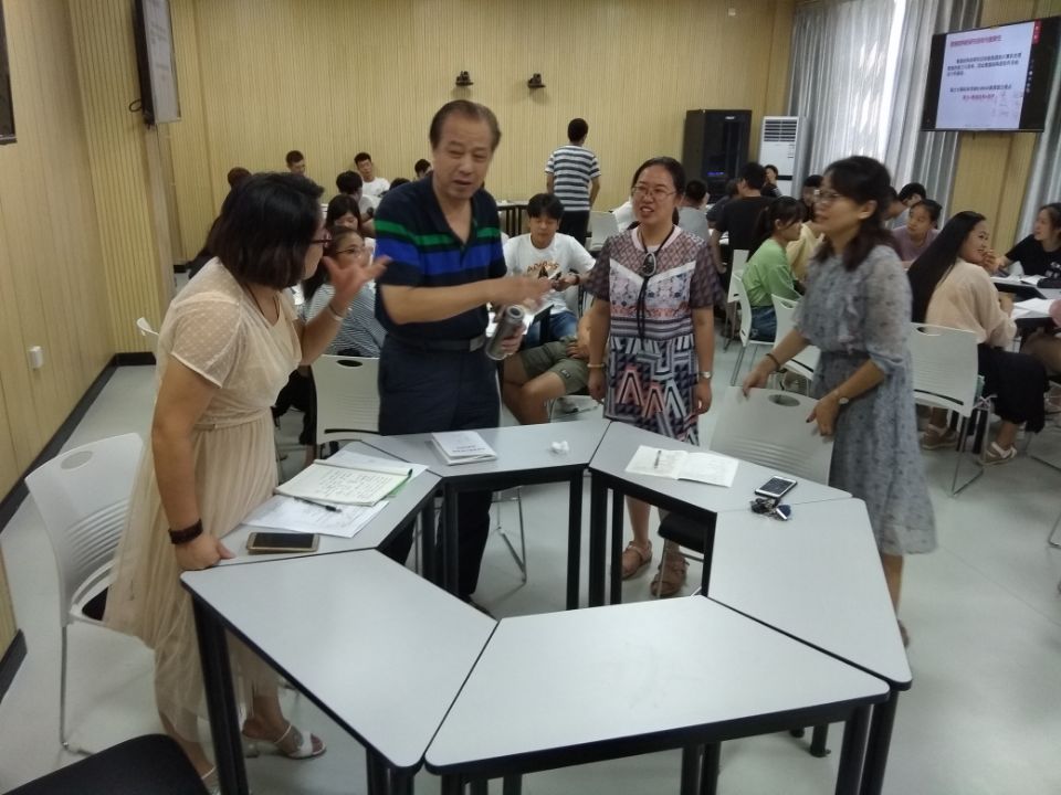 校长李友清教授同学子们一起上课,边听讲,边做笔记。课间,他和杨老师交流说,举的图书馆例子,生动形象,课堂把握好,同学们的课堂气氛很活跃,要保持下去。