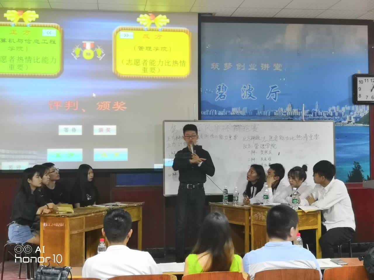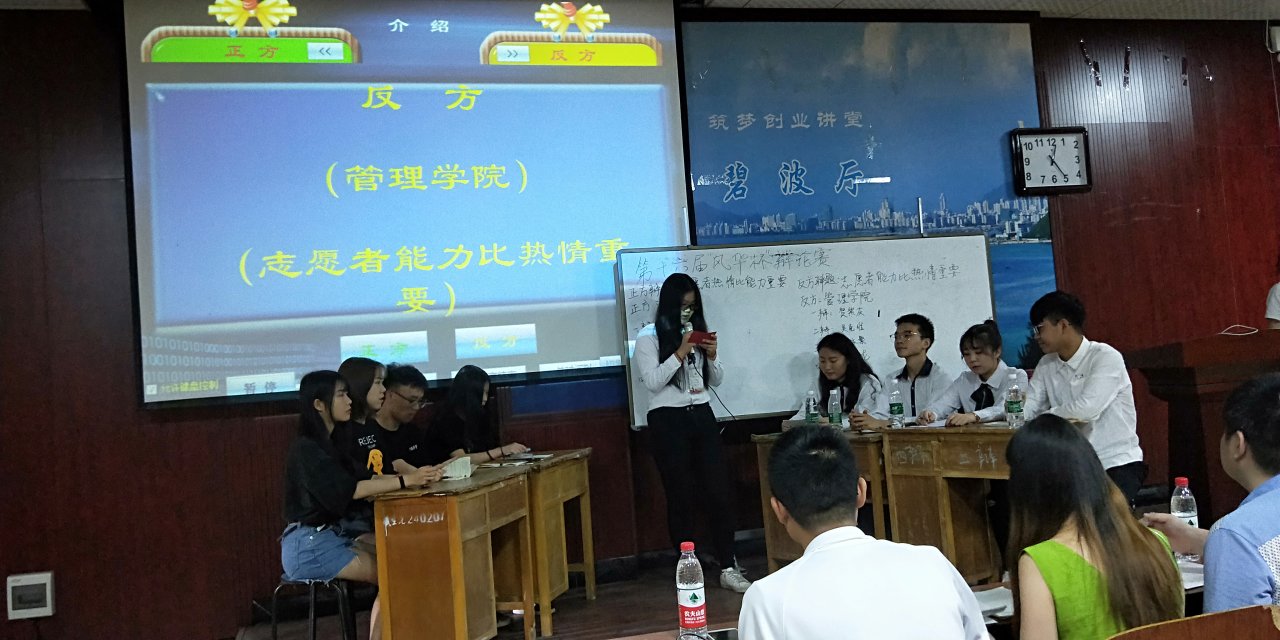 这次比赛队伍分别来自于计算机与信息工程学院的“计信一队”和管理学院的“绝地求生队”。两队就“志愿者能力和热情谁更重要”这一辩题展开了精彩的辩论。