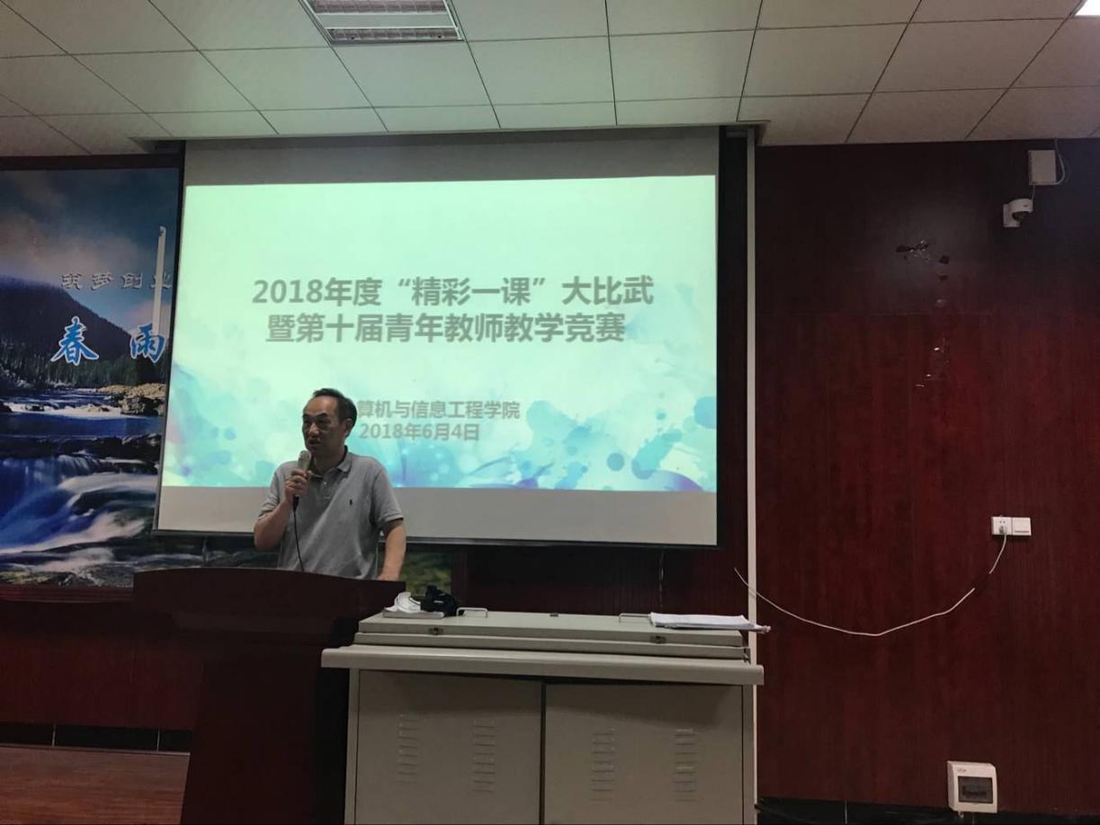 本网讯(通讯员邓恒恒 唐思铭 黄敏 摄影景吉林)6月4日下午,计算机与信息工程学院在九号楼举行了“精彩一课”大比武暨第十届青年教师教学竞赛。院长何穗教授、副院长周方副教授和各教研室主任到场担任评委,全体教师和部分同学到场观摩。