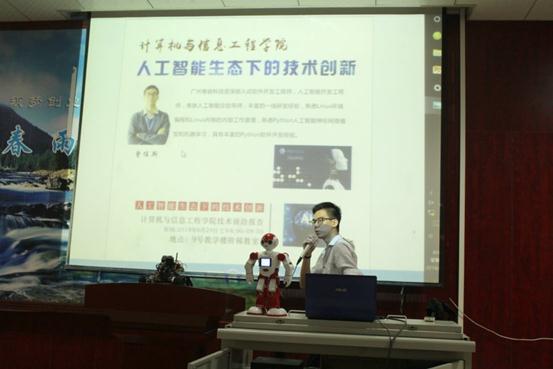 本网讯(通讯员黄思思 黄敏 摄影 陈艳)6月29日上午,计算机与信息工程学院在九号楼开展了以广州粤嵌科技专家曾任斯主讲的“人工智能生态下的技术创新”为主题的前沿报告。院长何穗教授出席并为报告做总结,副院长周方副教授致辞,全院任课老师和学生参加了报告会。