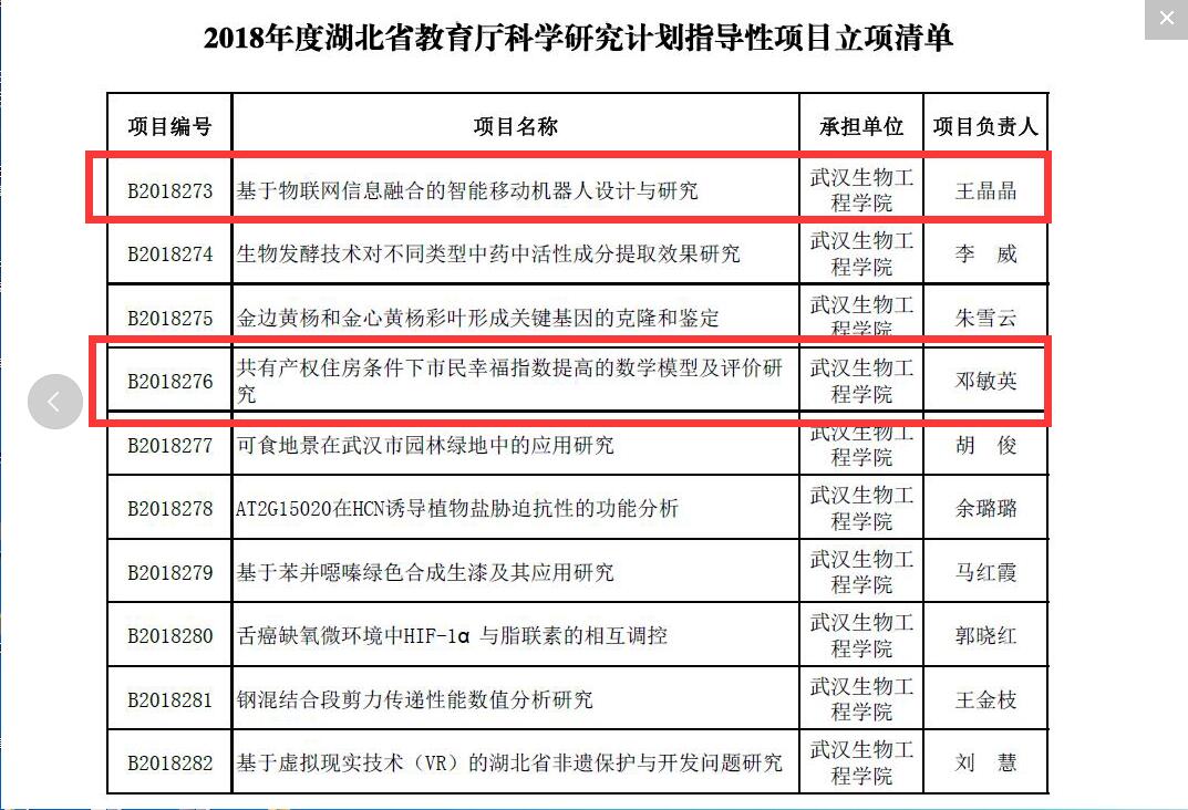 本网讯(通讯员 黄敏)日前,从湖北省教育厅办公室获悉,2018年度湖北省教育厅科学研究计划指导性项目立项清单已出炉,我校获批10项,其中计算机与信息工程学院占了2项。