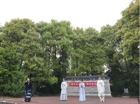 图为分团委副书记刘恩光、楚韵华服社和绿洲文学社学生代表领读《大学》节选部分