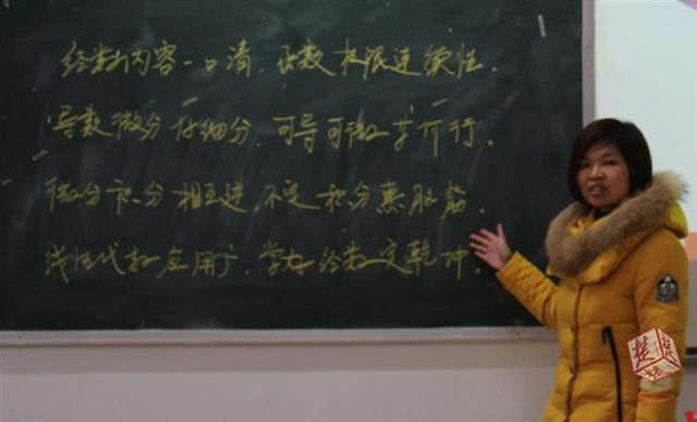 楚天都市报3月12日讯(记者柯称 通讯员黄敏)“经数内容一口清,函数极限连续性。导数微分仔细分,可导可微等价行。微分积分相互逆,不定积分惠脑筋。线性代数应用广,学好经数定乾坤。”数学不好的人,是不是觉得这首诗朗朗上口,却又难以理解?这首藏谜诗的作者是武汉生物工程学院胡芳副教授。今天上午,胡芳为该校计算机与信息工程学院2017级电子商务专业的学生开讲《经济数学》第一课时,在黑板上写下了这首诗,引来学生们的热烈讨论。