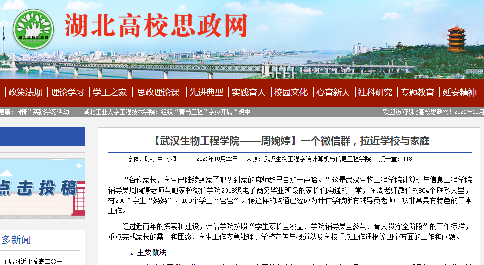 学院在构建家校微信学院“N+1+1”协同育人模式的过程中,注重项目的育人成效和工作总结研究。一是计科学院5个专业、91个班集体、3800余名同学和家长,全部加入到家校微信学院的平台上来,共同促进学生成长。二是通过家校联动互助,处置学生矛盾、学业困难、心理帮扶、经济困难、就业困难50余例,协助学生紧急处置5例,共同维护学生身心健康和安全稳定。三是通过家校共建,为学院教学和学生工作服务提出改进建议20余条,促进学院发展。四是该模式已获批校级研究课题2项,汇编材料2册,在湖北省高校思政网等等媒体发表网络文章3篇。