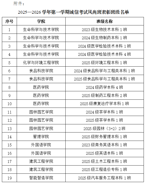 根据《关于开展2025—2026学年第一学期“无人监考”工作的通知》(武生教字〔2025〕109号),在2025—2026学年第一学期期末考试中,全校共有20个班级申请参加“无人监考”考试。经综合考核与公示,生命科学与技术学院2023级生物技术本科1班等19个班级在考试过程中自觉遵守考场纪律,坚守诚信底线,恪守承诺,诚实应考,无任何违纪违规行为。学校决定授予上述19个班级“诚信考试风尚班”荣誉称号(具体名单详见附件)。