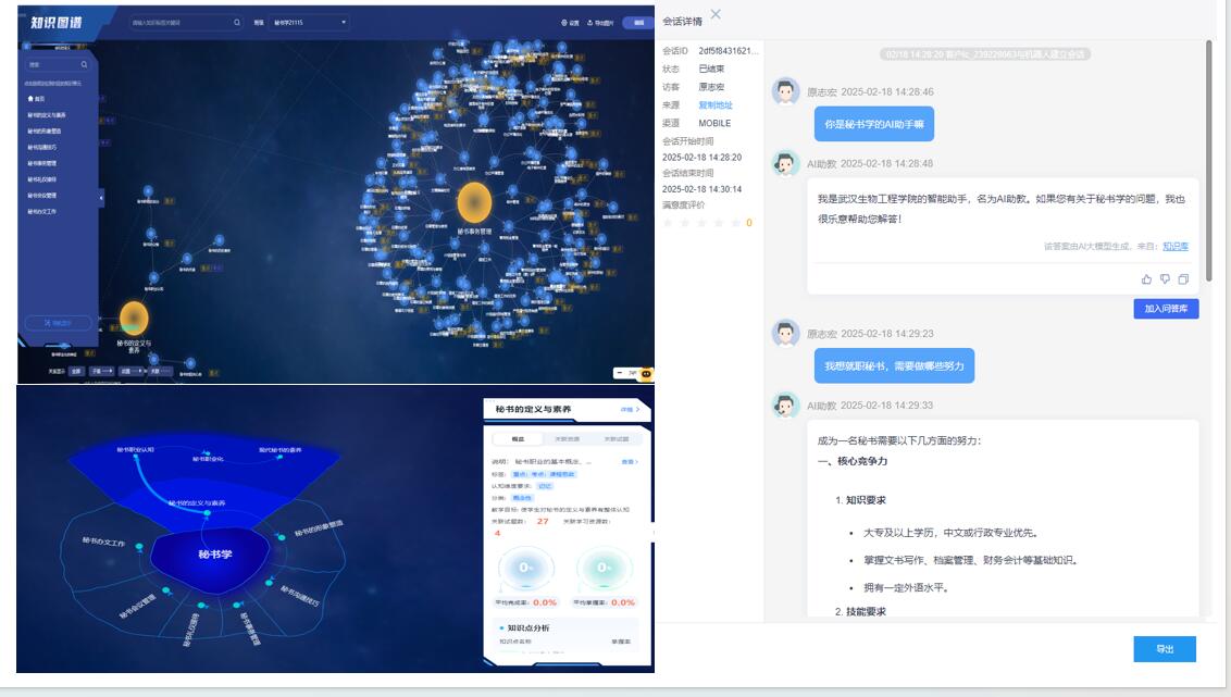 培训内容结合主讲人对AI赋能教学较为深入的探索,及其本学期所教授课程“秘书学”的数智化教学实践开展。涵盖了AI赋能教学的背景与意义、系列AI工具助力三阶混合式教学策略、学习通平台及AI 助教应用、知识图谱建设与教学应用场景等多个方面。详细介绍了Kimi、DeepSeek、智谱清言、豆包等AI工具的功能与操作流程,并通过实例演示,展示了如何利用AI工具生成课程教学设计、思维导图、教学图片资源以及数字人微课,分享了AI助教在教学过程中起到的学习脚手架与学习陪伴者功用,并建议老师们充分利用AI学情分析功能,不断优化教学策略等。