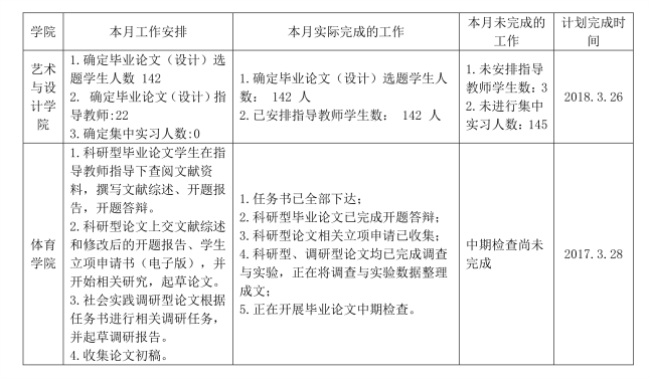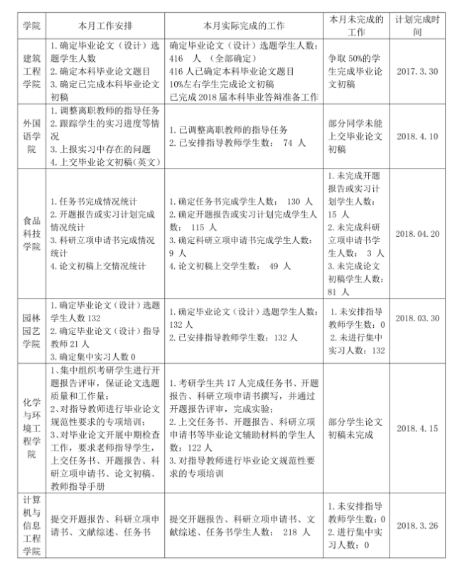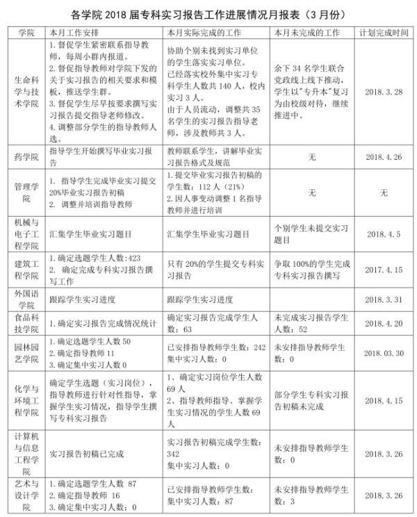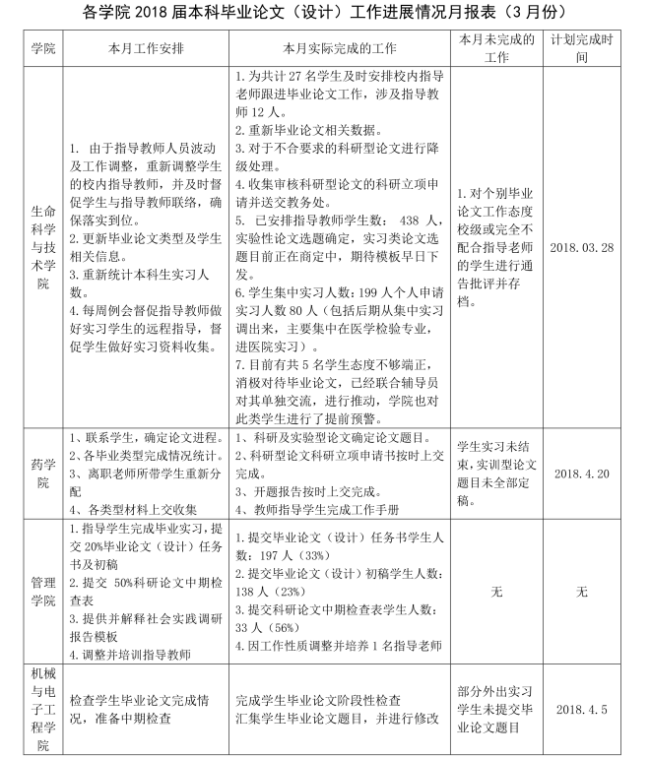 根据各学院报送的2018届本科毕业论文(设计)、专科实习报告工作进展情况,现将各学院相关工作予以通报,详情见附件。