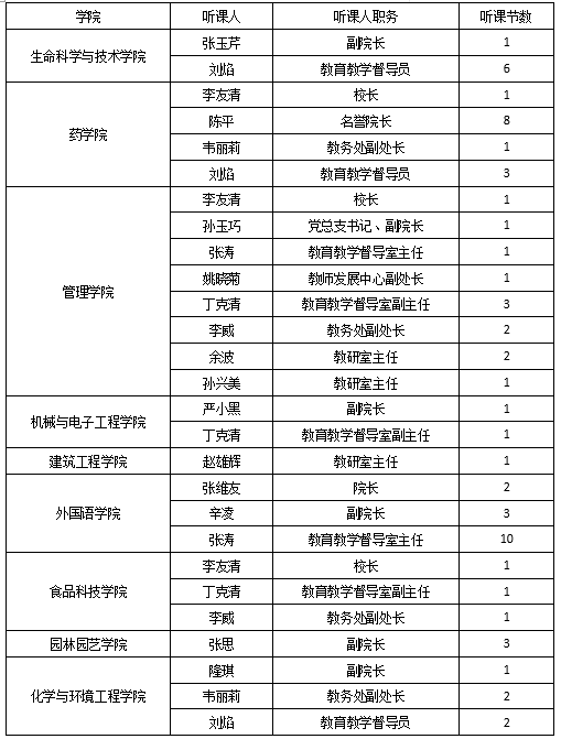 本学期第十二周(5月21日至5月25日),李友清校长,教务处、培训处、教育教学督导室负责人,各学院管理干部对全校课堂进行了随机听课,本周听课课堂共计93个,共43人参与听课,其中,“优”等级课堂数17个,占听课节数的18.3%;“良”等级课堂数67个,占听课节数的72.0%;“中”等级课堂数9个,占听课节数的9.7%。第12周听课结果统计表详见附件一,各学院听课统计表详见附件二。
