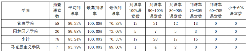 校教学信息中心第7周(4月16日至4月20日),在5、6号教学楼随机抽查了78个课堂,涉及管理学院、园林园艺学院和马克思主义学院3个学院,平均到课率85.24%,到课率均高于70%,抽查结果较好。其中,最高到课率为100.00%;最低到课率为70.33%;到课率100%的有17个课堂,占抽查总数的21.79%;到课率在90%(含)-100%之间的有28个课堂,占抽查总数的35.90%;到课率在80(含)-90%之间的有17个课堂,占抽查总数的21.79%;到课率在70(含)-80%之间的有16个课堂,占抽查总数的20.51%。第7周查课情况详见附件1。