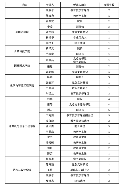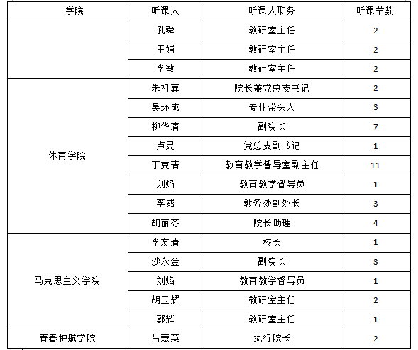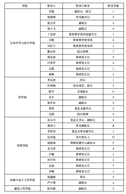 本学期第七周(4月16日至4月20日),李友清校长,教育教学督导室、教务处、培训处负责人,各学院管理干部对全校课堂进行了随机听课,本周听课课堂共计228个,共81人参与听课,其中,“优”等级课堂数68个,占听课节数的29.8%;“良”等级课堂数134个,占听课节数的58.8%;“中”等级课堂数22个,占听课节数的9.6%;“差”等级课堂数4个,占听课节数的1.8%。第7周全校听课结果统计表详见附件一,各学院管理干部听课情况统计表详见附件二。