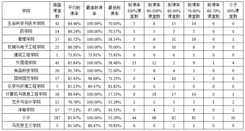 校教学信息中心第8周(4月23日至4月28日),在全校教学楼随机抽查了287个课堂,涉及13个学院,全校平均到课率83.97%,抽查结果一般。其中,最高到课率为100.00%;最低到课率为35.29%;到课率100%的有44个课堂,占抽查总数的15.33%;到课率在90%(含)-100%之间的有68个课堂,占抽查总数的23.69%;到课率在80(含)-90%之间的有82个课堂,占抽查总数的28.57%;到课率在70(含)-80%之间的有81个课堂,占抽查总数的28.22%;到课率在60(含)-70%之间的有2个课堂,占抽查总数的0.70%;到课率在60%以下的有10个课堂,占抽查总数的3.48%。第8周查课情况详见附件1。