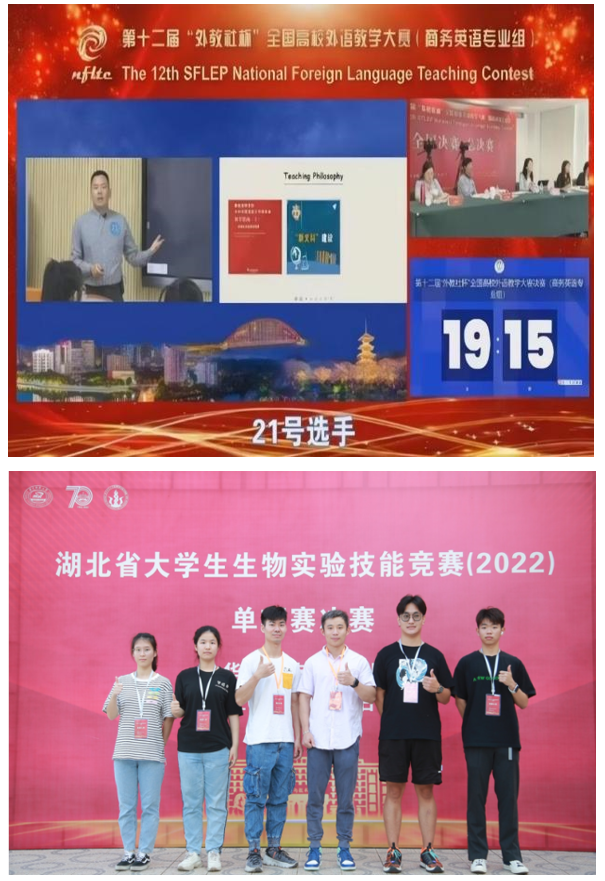 2022年,我校周逸轩老师以湖北赛区决赛特等奖的成绩,代表湖北省参加第十二届“外教社杯”全国高校外语教学决赛(商务英语组),与来自暨南大学、首都经济贸易大学等高校的29名教师同台竞技,以总分排名13的成绩获三等奖,此外,由周逸轩、祝懿婷、郭漫和骆薇组成的教学团队打磨的教学设计也荣获全国三等奖。学校5个教学团队获评第二届“智慧树杯”课程思政示范案例教学大赛二等奖。
