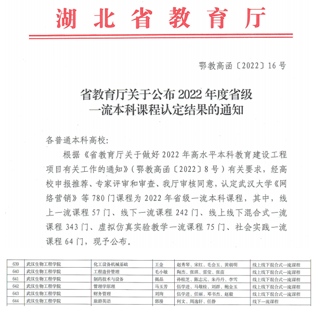 2022年12月,学校获批《制药技术与设备》等6门省级一流本科课程。学校通过实施一流课程行动计划,建立三级课程体系,先后推动五类“一流课程”建设,截止目前,14门课程获批湖北省一流本科课程,《化工原理》获批首批国家级一流本科课程。