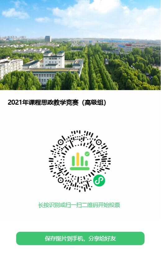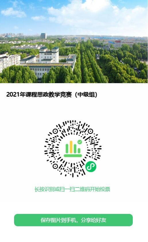 为全面推进课程思政建设,形成“课程门门有思政,教师人人讲育人”的良好氛围,学校组织开展2021年课程思政教学竞赛活动,现将候选人课程简介集中展示(排名不分先后),欢迎同学们踊跃参加,请扫描二维码参加投票。