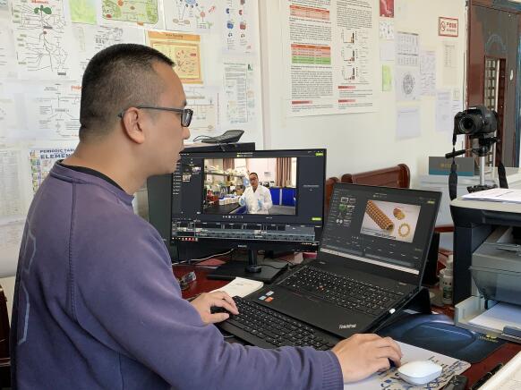 认真整理归纳承担此项教学任务2两年来的教学资料和文件,仔细总结在教学过程中发现的不足和问题,充分吸收教学团队成员间交流形成的经验体会,成了徐飞博士假期中整理课程“剧本”的重要措施。大年初四,春节假期尚未结束,集导演、编剧,演员,摄影,剪辑等角色于一身的“全能”教授就开始了自己的录课工作。为了追求更清晰的画质,他将家里能够使用的摄录器材尝试个遍,最终选择了一台单反相机,为了保证录制效果和剪辑进度,他选择了在应用生物技术研究中心的工作室中渡过了一个春节假期。经过紧锣密鼓的准备,25个包含讲义、视频讲解,动画演示的课程视频已于2月17日通过学习通平台顺利上线,呈现给了选择该门课程的117位同学。
