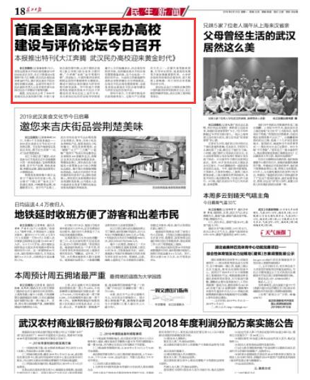 长江日报讯(记者杨佳峰)今日,首届全国高水平民办高校建设与评价论坛在汉召开,长江日报推出8连版特刊《大江奔腾 武汉民办高校迎来黄金时代》,展示武汉高水平民办高校的建设成就。全国百所高水平民办高校负责人以及专家学者与会探讨民办大学建设与管理问题。