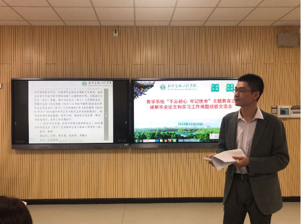 会上,药学院院长助理尤园和化学与环境工程学院·食品科技学院院长助理田野分别就实习工作和毕业论文(设计)工作经验进行了交流发言。