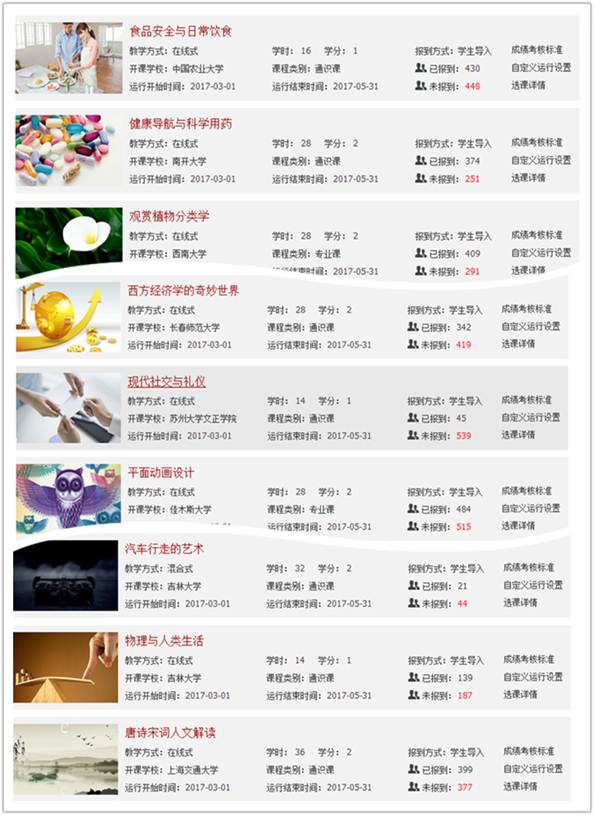 本讯网(通讯员 王泽立)为拓展教学空间,提高教学质量,创新教学形式,本学期我校继续运用慕课资源,与联合超星尔雅和智慧树公司共同开设23门慕课课程,截止目前共计20000余人注册选课。