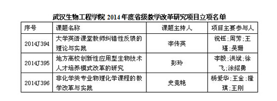 本网讯(通讯员 刘春侠)12月18日,湖北省教育厅公示了“2014年高等学校省级教学改革研究项目”名单,我校“地方高校创新性应用型生物技术人才培养模式改革的研究”等3个项目名列其中。