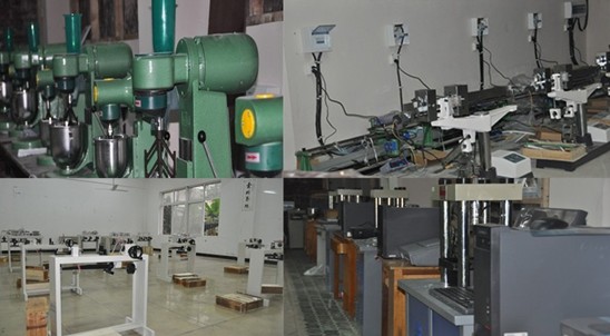 建筑系引进的水泥胶砂搅拌机(左上)、电动抗折机(右上)、单联等应变直剪仪(左下)、水泥抗压抗折试验机(右下)等设备