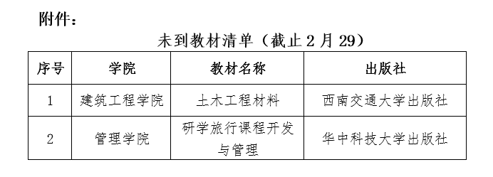 2024年春季学期教材现有2种教材因出版社加印、天气、物流延时等客观原因尚未到货(详细清单见附件),暂时无法发放,这部分教材将在货到后通知各班级前往领取。