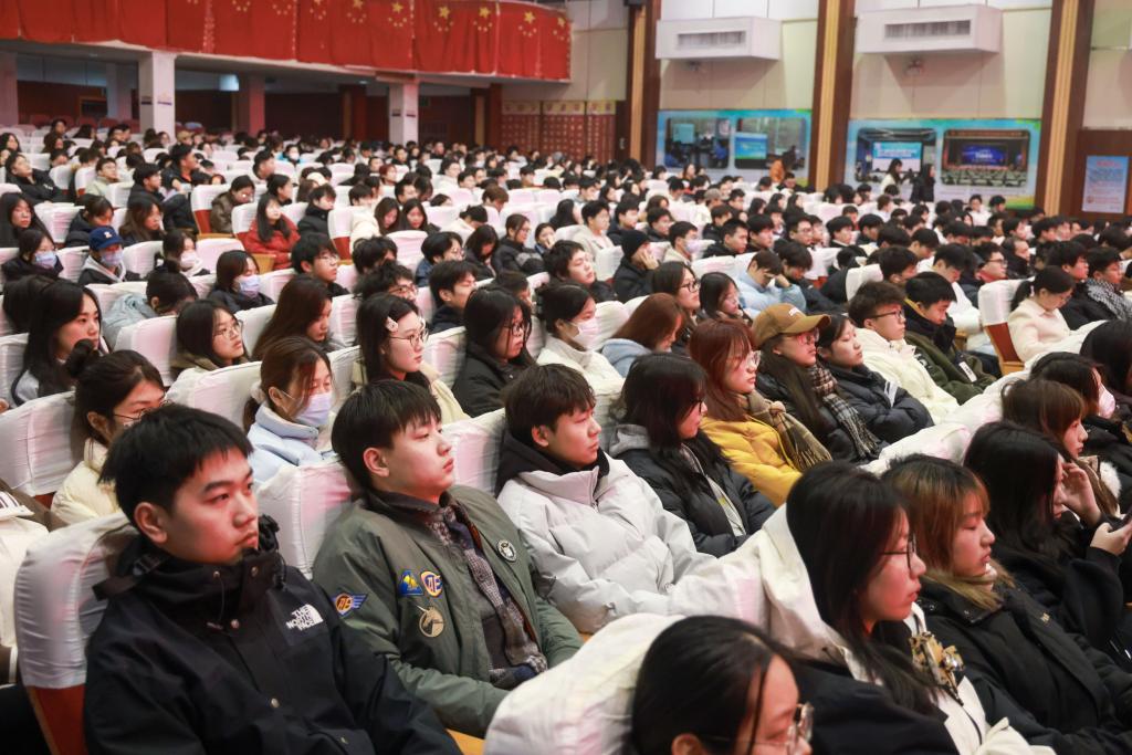 师生代表在大礼堂集中收看全国两会开幕盛况(摄影 谈宇锋)