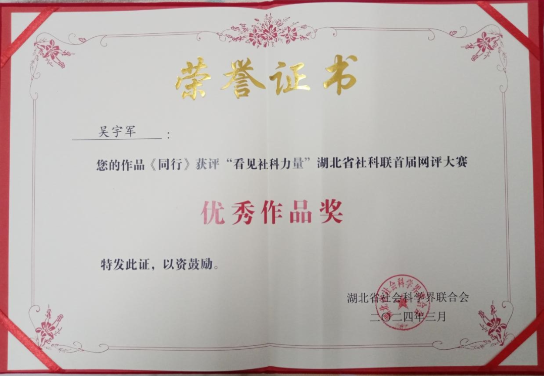 本网讯(通讯员 王刚)3月22日,“看见社科力量”湖北省社科联首届网评大赛颁奖仪式在武汉举行。经专家评委评审、公示,从中评选出优秀作品奖30篇。其中,我校教务处处长助理吴宇军作品《同行》获“优秀作品奖”。