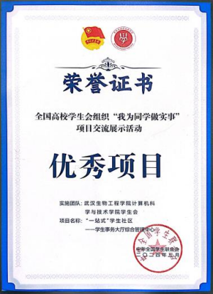 本网讯(通讯员 黄尧)3月24日,由共青团中央指导,全国学联主办,团贵州省委、贵州省学联、贵州师范大学承办的全国高校学生会组织“我为同学做实事”项目交流展示活动在贵州落下帷幕。经现场答辩、专家评审、同学满意度调查等环节,我校计算机科学与技术学院推报的“‘一站式’学生社区——学生事务大厅综合管理中心”项目获评全国高校学生会“优秀项目”。