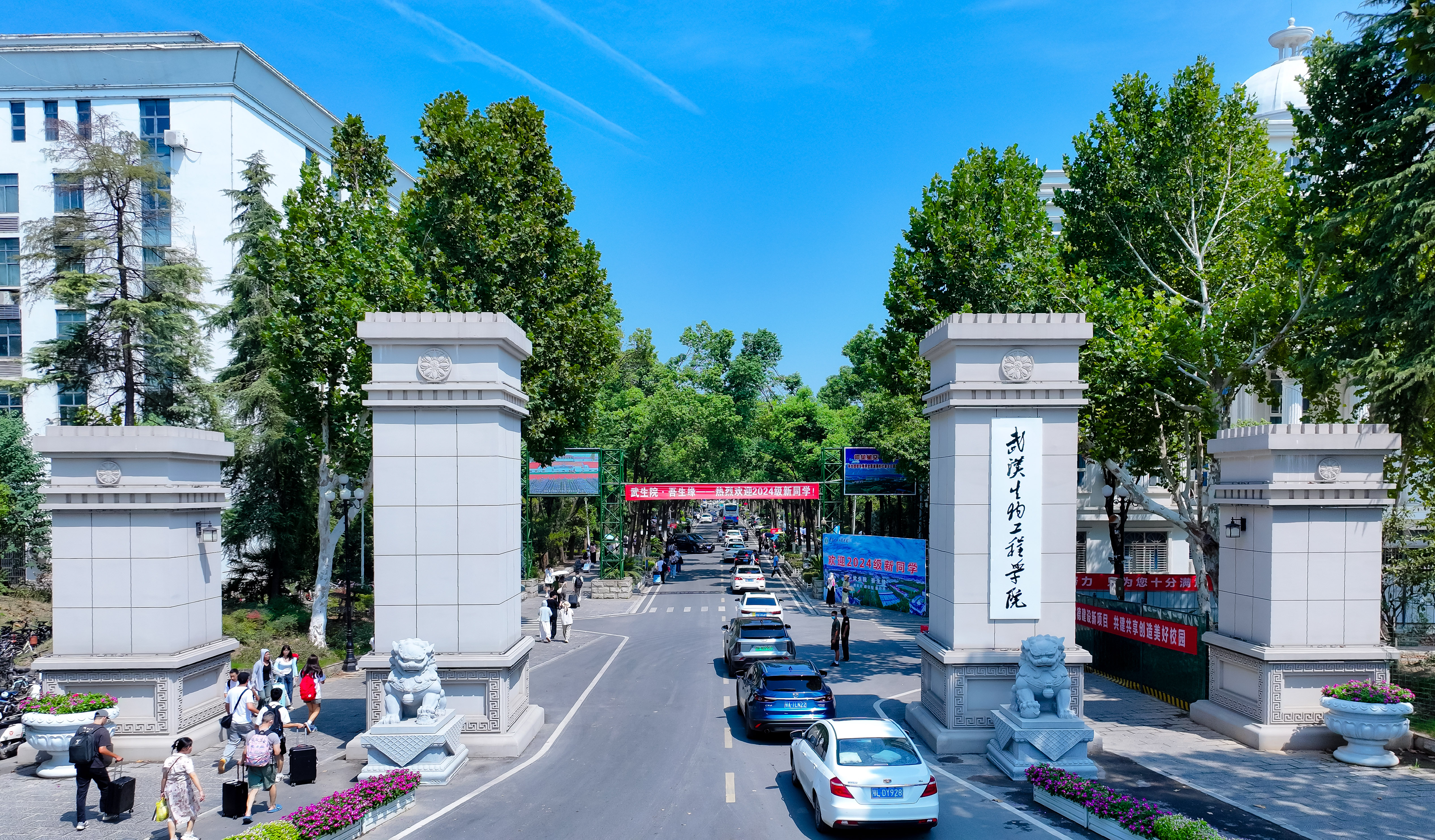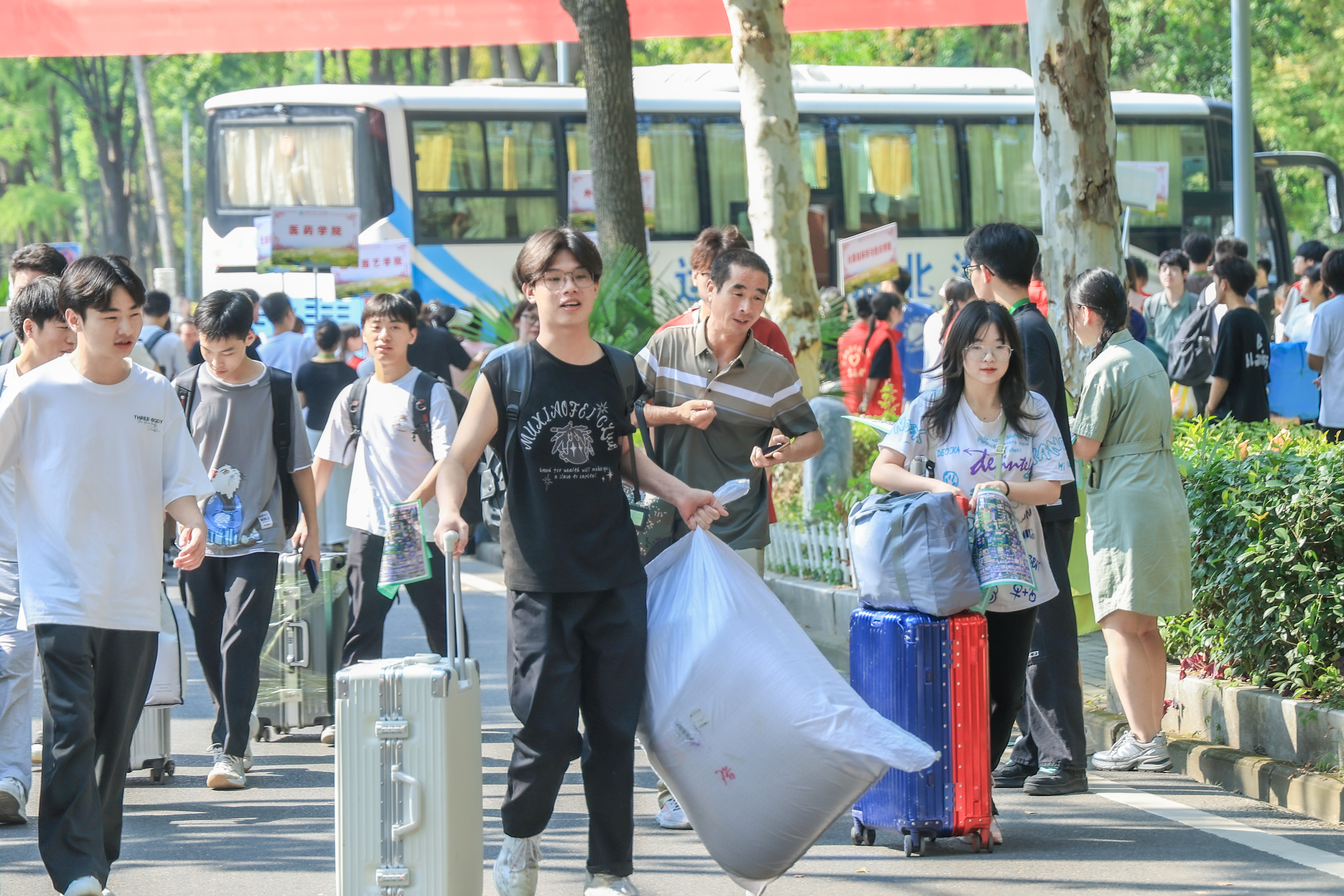 校园内外处处洋溢着欢迎新生的氛围,创意十足的红色温馨标语、精心设计的合影立牌、热情洋溢的师生和志愿者们,无一不在热烈欢迎新同学。一大早,人群和车辆从校大门鱼贯而入,自驾车、网约车、出租车,自强路俨然钢铁长龙。校园各处人声鼎沸,各学院迎新工作如火如荼。
