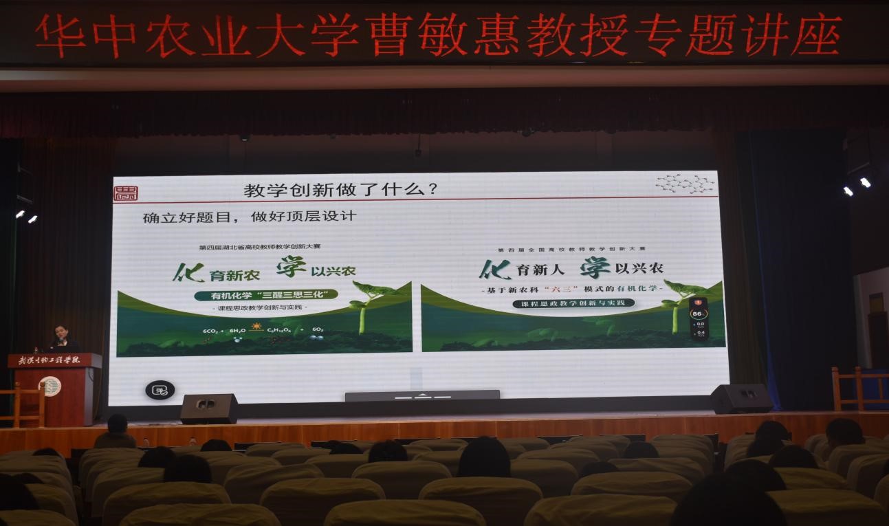 本网讯(通讯员 刘晓琴)为深入推进学校教育教学改革,进一步提升教师教学创新能力,11月22日,学校邀请第四届全国高校教师教学创新大赛全国一等奖获得者华中农业大学曹敏惠教授来校开展专题讲座。各学院院长、分管教学工作副院长、教研室主任、无课专任教师、第五届教学创新大赛培育教师,教务处、教育教学督导室、人事处等部门负责人参加,讲座由副校长董妍玲主持。