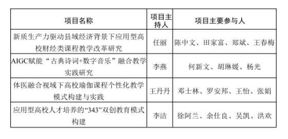 经学校申报推荐、专家评审和审查、公示,获批立项的项目分别是管理学院任丽的《新质生产力驱动县域经济背景下应用型高校财经类课程教学改革研究》,文学院李燕的《AIGC赋能“古典诗词+数字音乐”融合教学实践研究》,体育学院王丹丹的《体医融合视域下高校瑜伽课程个性化教学模式构建与实践》,创新创业学院李洁的《应用型高校人才培养的“343”双创教育模式构建》。