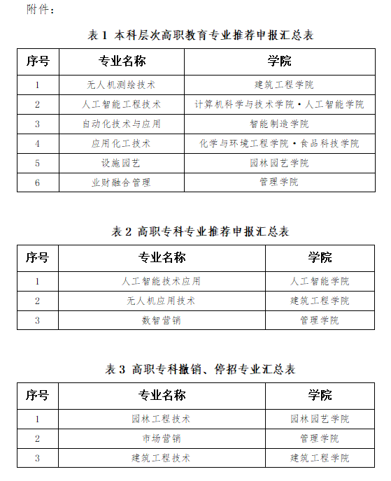 经专业需求调研和专业设置论证、学院申报和校内外专家评审,学校拟申报无人机测绘技术等6个职业本科专业,人工智能技术应用等3个高职专科专业,撤销高职专科专业2个,停招高职专科专业1个(详见附件)。
