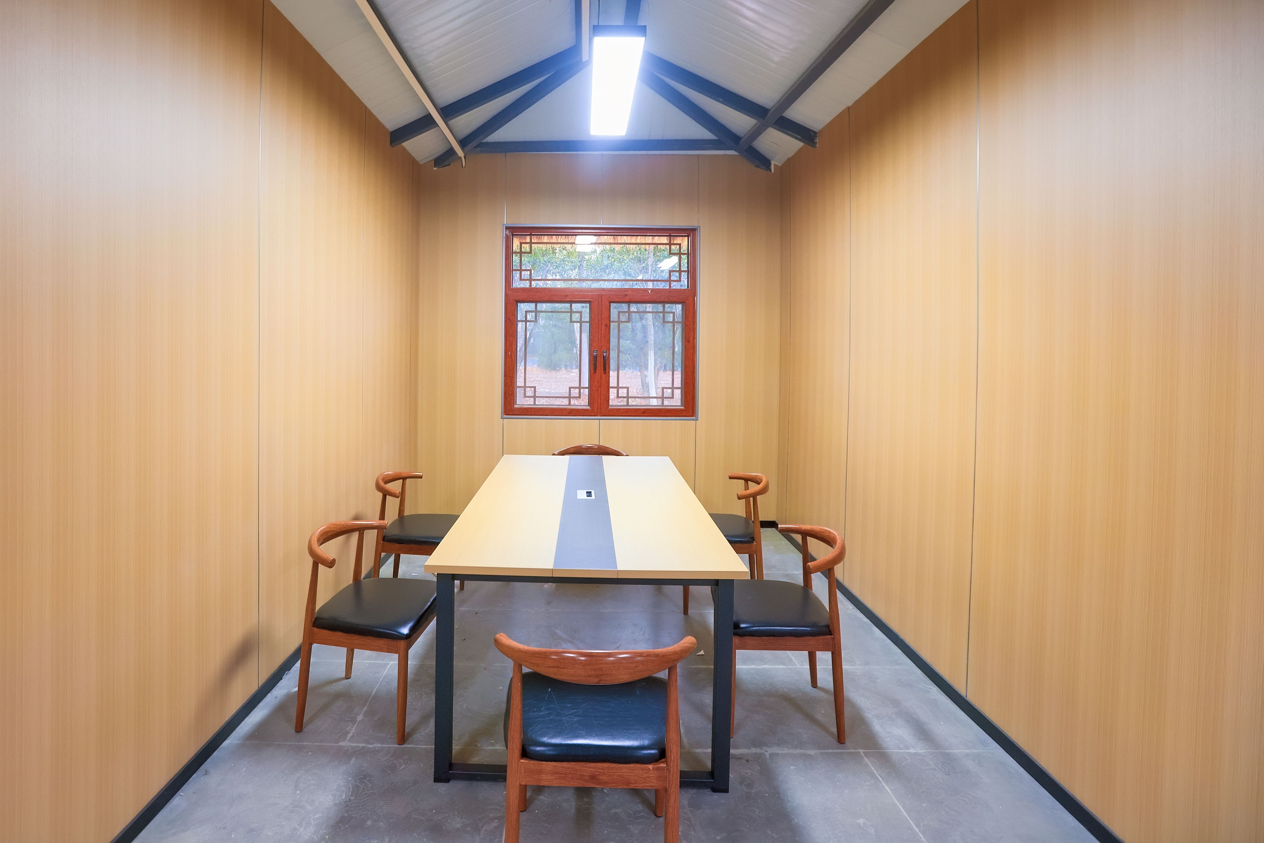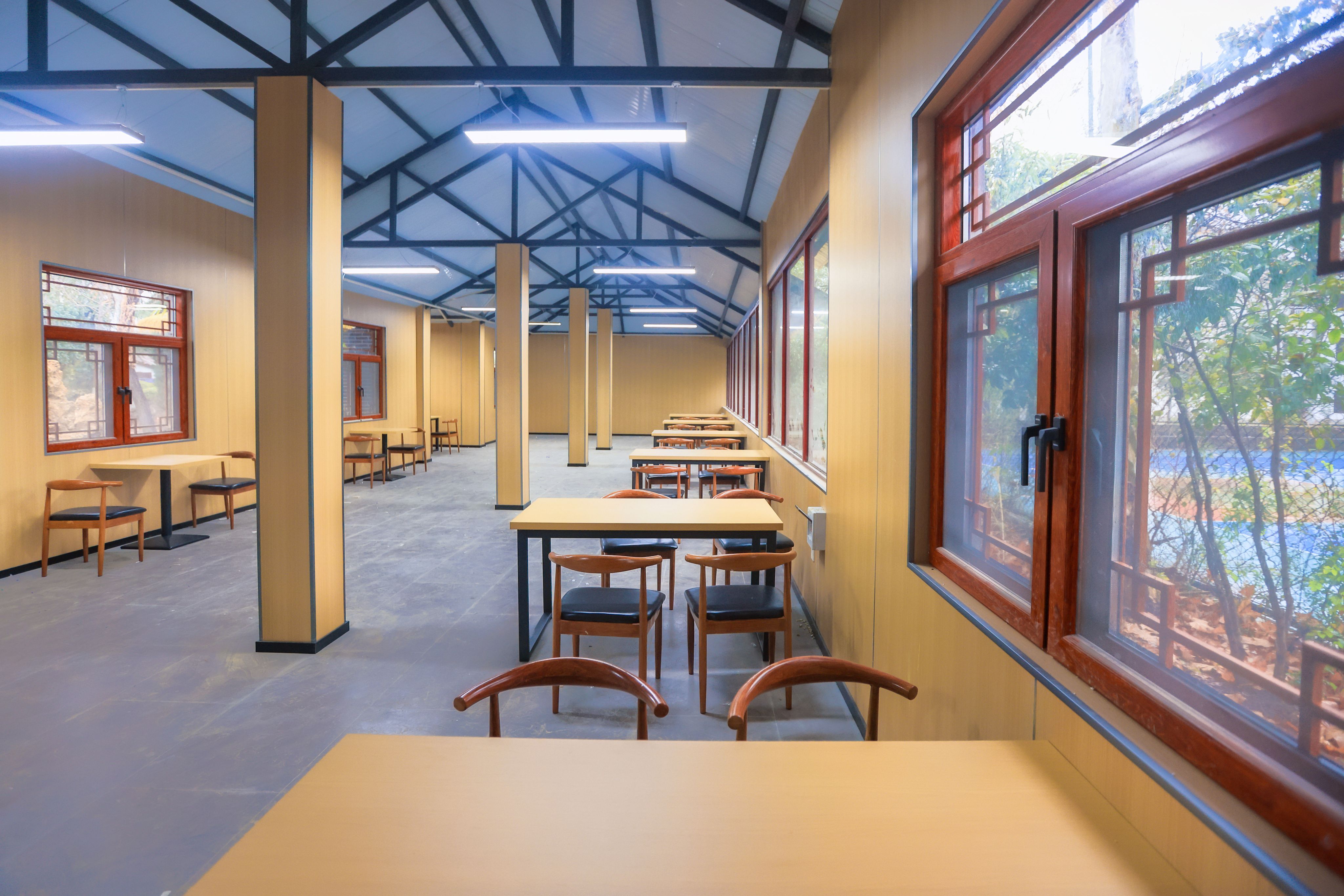 室内空间则以现代简约风格为主调,浅木色桌椅排列有序,兼顾舒适性与实用性;两侧通透玻璃幕墙巧妙引入室外景致,实现自然与人文的有机交融。柱间悬挂的红底黑字书法作品,笔力遒劲、意蕴深厚,为空间平添浓郁的文化气息,彰显书院“以文化人、以美润心”的核心理念。