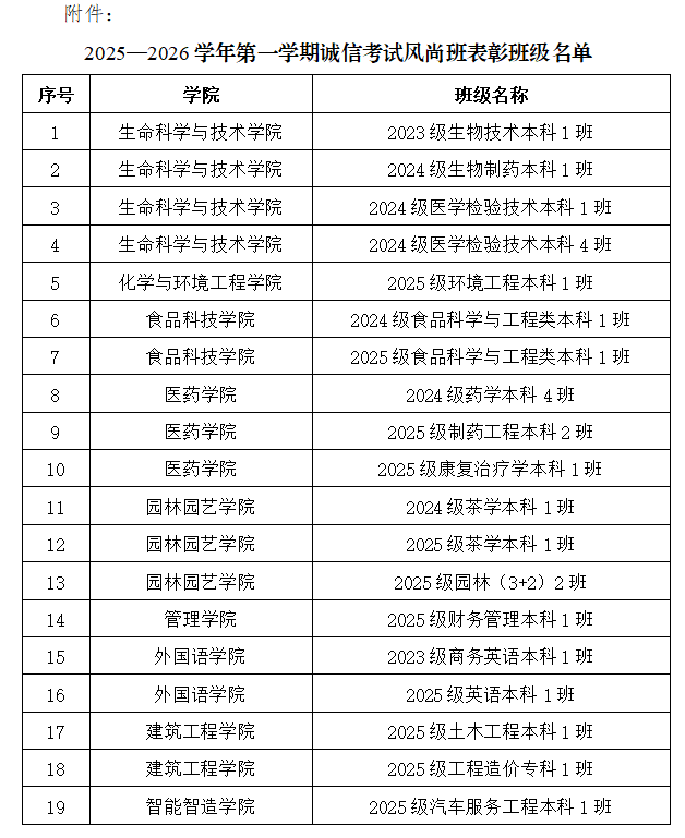 根据《关于开展2025—2026学年第一学期“无人监考”工作的通知》(武生教字〔2025〕109号),2025—2026学年第一学期,各学院共有20个班级申请了无人监考,学校对参加无人监考的班级进行了综合考核,经研究决定,拟授予生命科学与技术学院2023级生物技术本科1班等19个班级“诚信考试风尚班”荣誉称号(具体名单详见附件)。