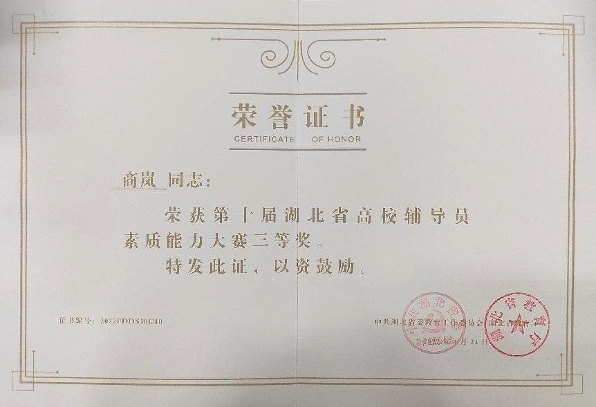 本网讯(通讯员 史钰荣)近日,由中共湖北省委教育工委、湖北省教育厅主办的第十届湖北省高校辅导员素质能力大赛暨2022年高校辅导员育人故事分享会成绩揭晓,建筑工程学院辅导员商岚荣获湖北省高校辅导员素质能力大赛三等奖。