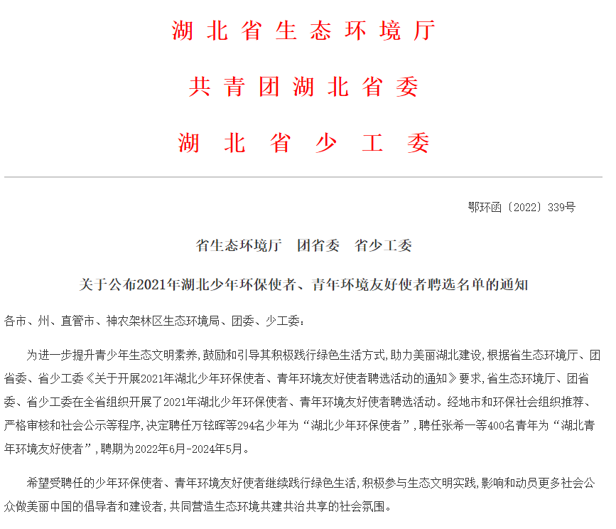 本网讯(通讯员 史钰荣)近日,由湖北省生态环境厅、团省委、省少工委联合开展的2021年湖北少年环保使者、青年环境友好使者聘选活动结果揭晓,我校建筑工程学院张希一、郭书浩、林群、刘林、王蕾、胡丽芳、黄柠等7名学生被聘任“湖北青年环境友好使者”,聘期为2022年6月至2024年5月。