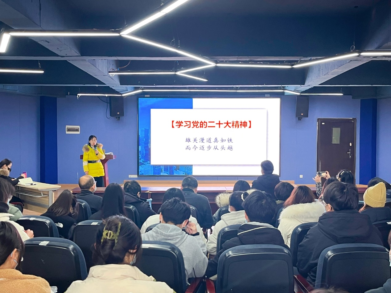 甘春晖以《雄关漫道真如铁,而今迈步从头越》为题,从党的二十大核心要义、深刻领会和学思践行三个方面进行了宣讲,特别是用9个数字带领我们回顾学习了二十大报告。她强调,学习党的二十大精神,事关党和国家事业继往开来,事关中国特色社会主义前途命运,事关中华民族伟大复兴,为新时代新征程党和国家事业发展、实现第二个百年奋斗目标指明了前进方向、确立了行动指南。我们全校党员干部和广大师生员工的思想和行为要统一到党的二十大精神上来,既要读原文、悟原理,还要“准确、完整、全面领会”,更要“联系实际,务求实效”。宣讲深入浅出、通俗易懂,她还通过我校秉持“自立自强、创新创业”理念,开展创新创业大赛案例深刻剖析了如何实现学校高质量发展。