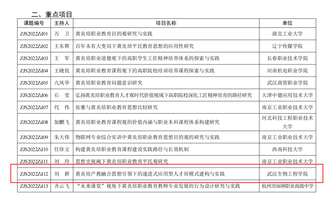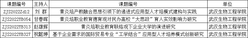 (通讯员 刘宇 )近日,中华职教社公布了第一届黄炎培职业教育思想研究规划课题立项名单,其中我校获批4项,其中2020年“荆楚好老师”获得者、建筑工程学院刘群教授主持的“黄炎培产教融合思想引领下的递进式应用型人才培模式建构与实践”获批重点课题。赵雄辉、甘春晖、祝懿婷等三位老师获批一般课题。