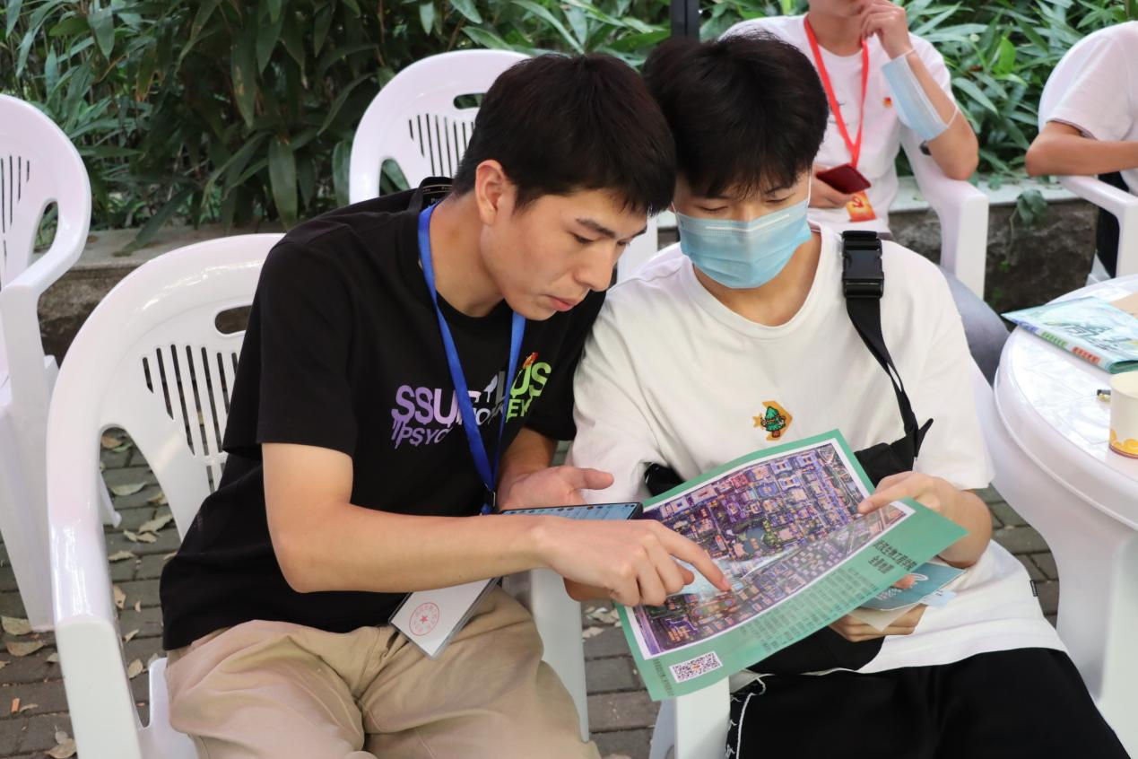 图为学生志愿者“一对一服务”为新生“导航”