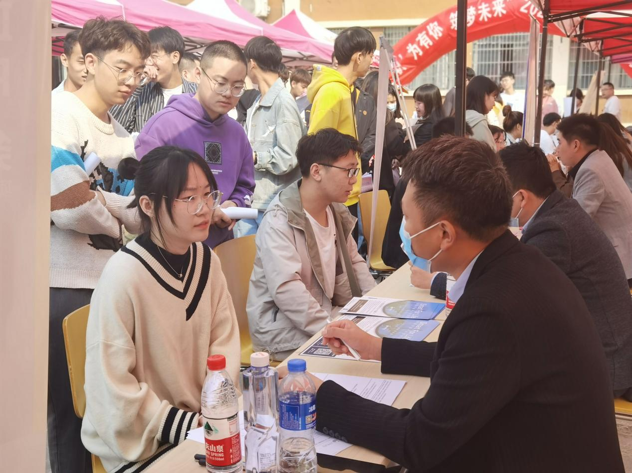 图为学院2022届毕业生与用人单位招聘负责人交流