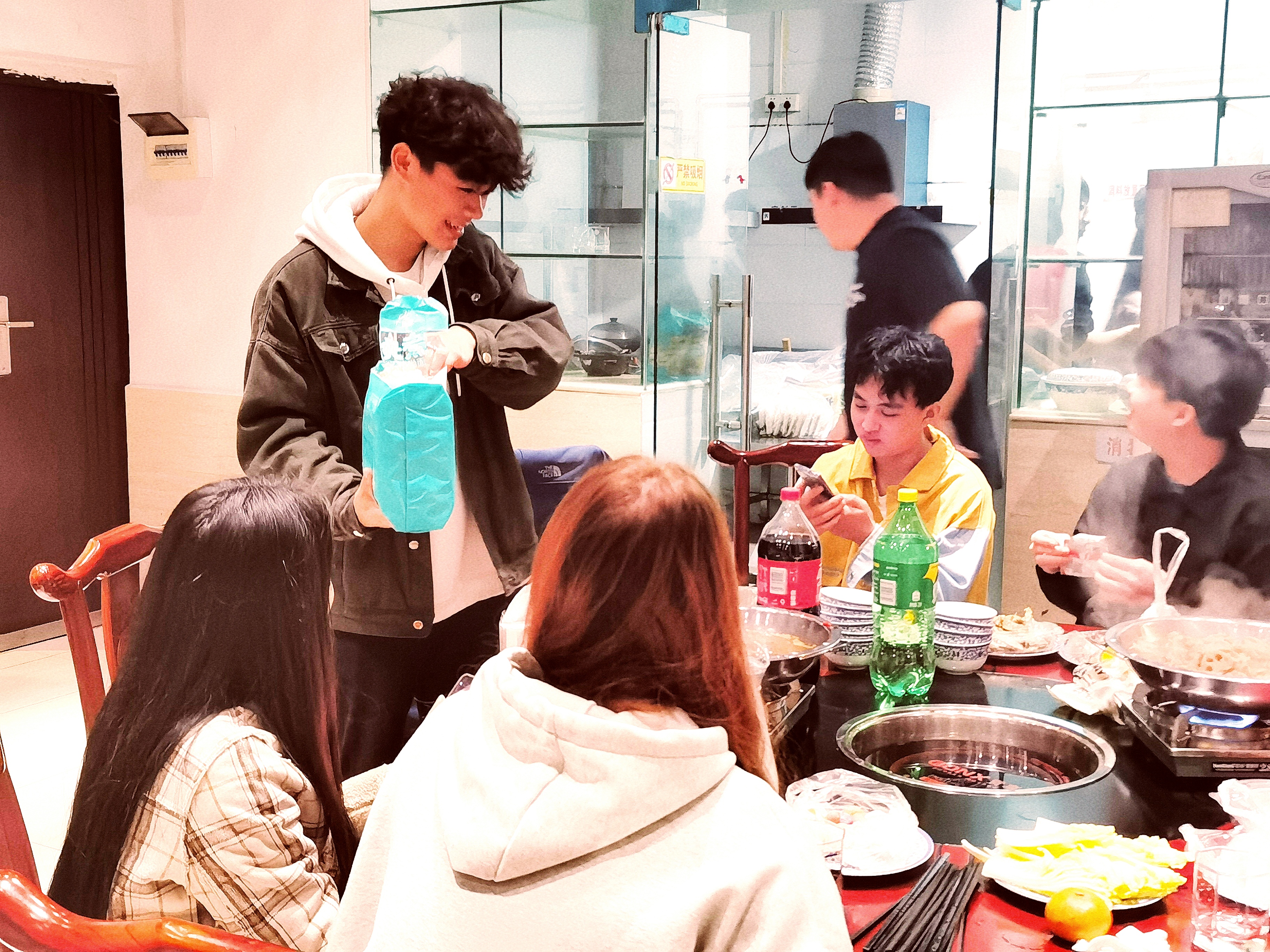 宴会开始前,各班级活动安全员介绍了“火锅宴”注意事项。宴会过程中,师生谈笑欢愉,涮着火锅,举杯互敬,氛围热烈。