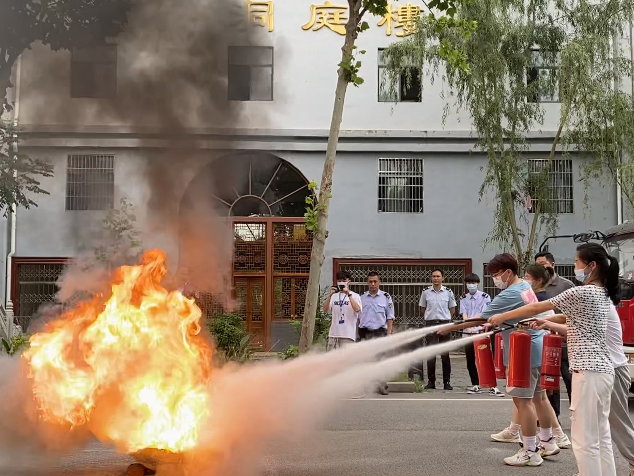 图为学生进行干粉灭火器进行实操演练