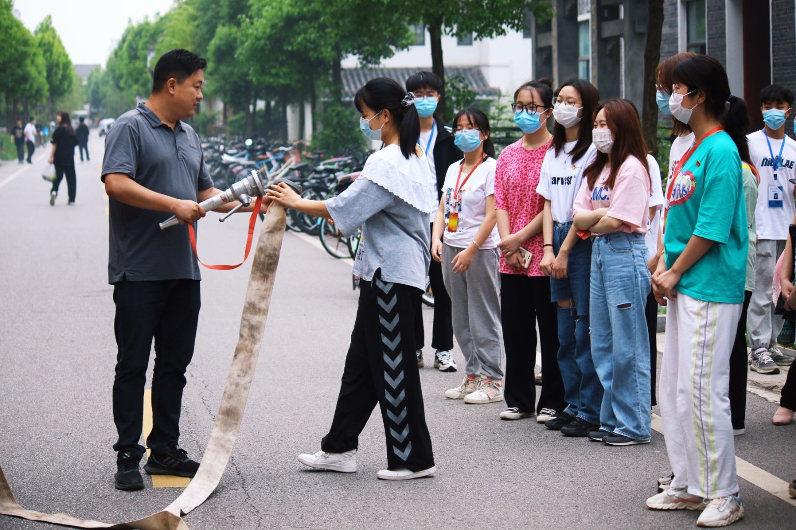 图为保卫处周志祥老师指导学院学生掌握消防栓的正确使用方法
